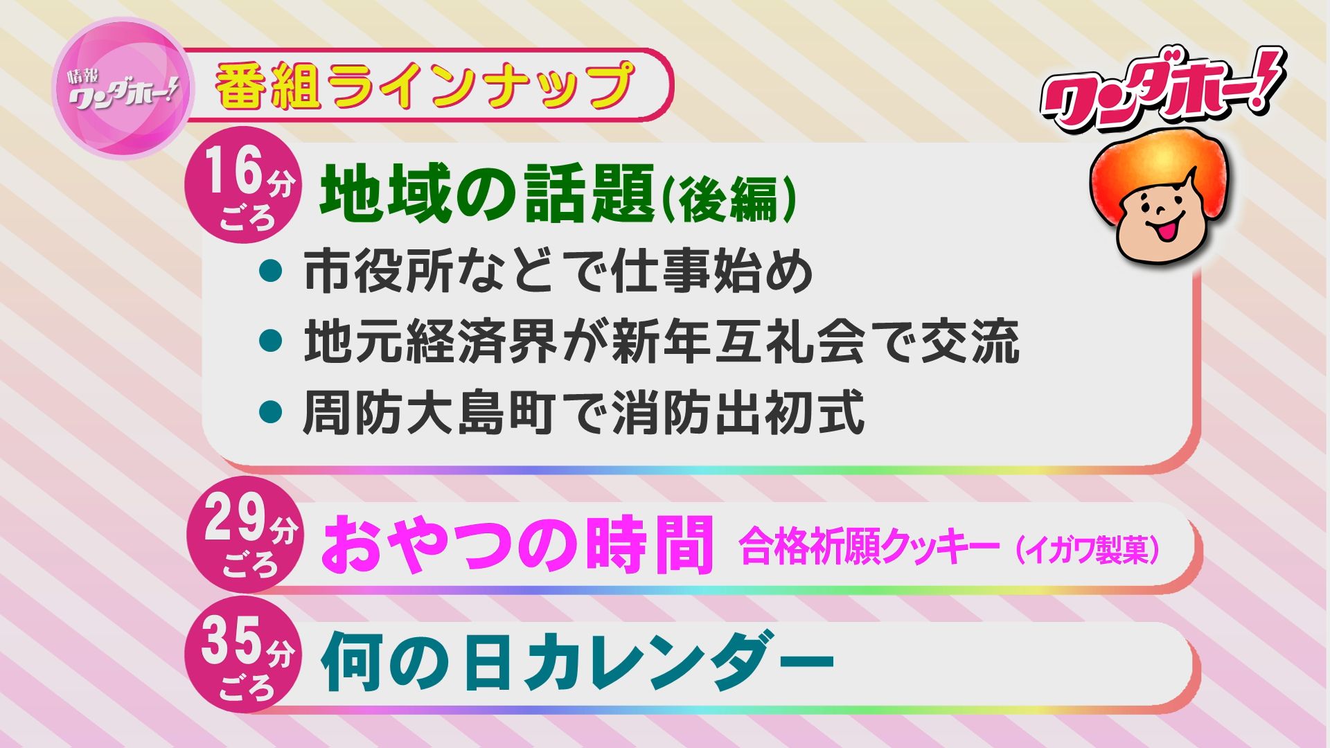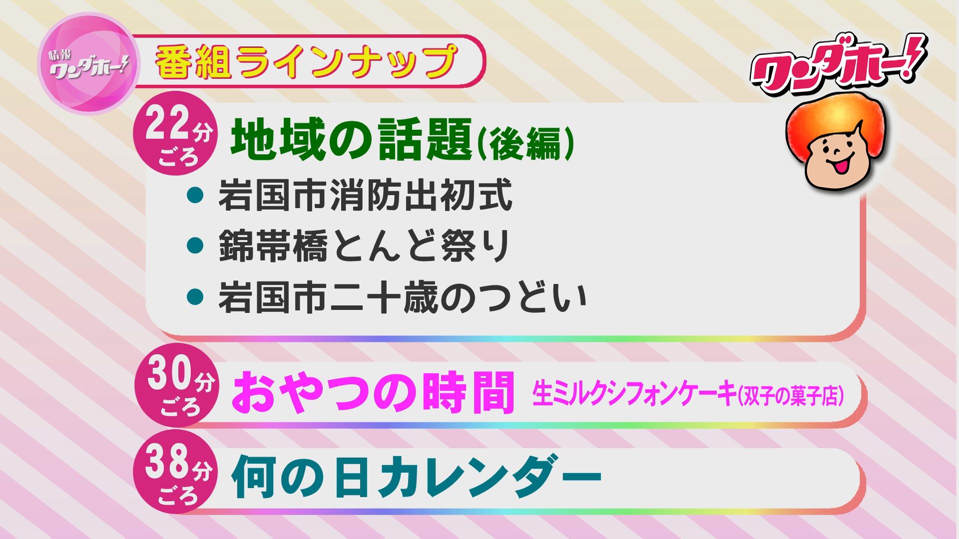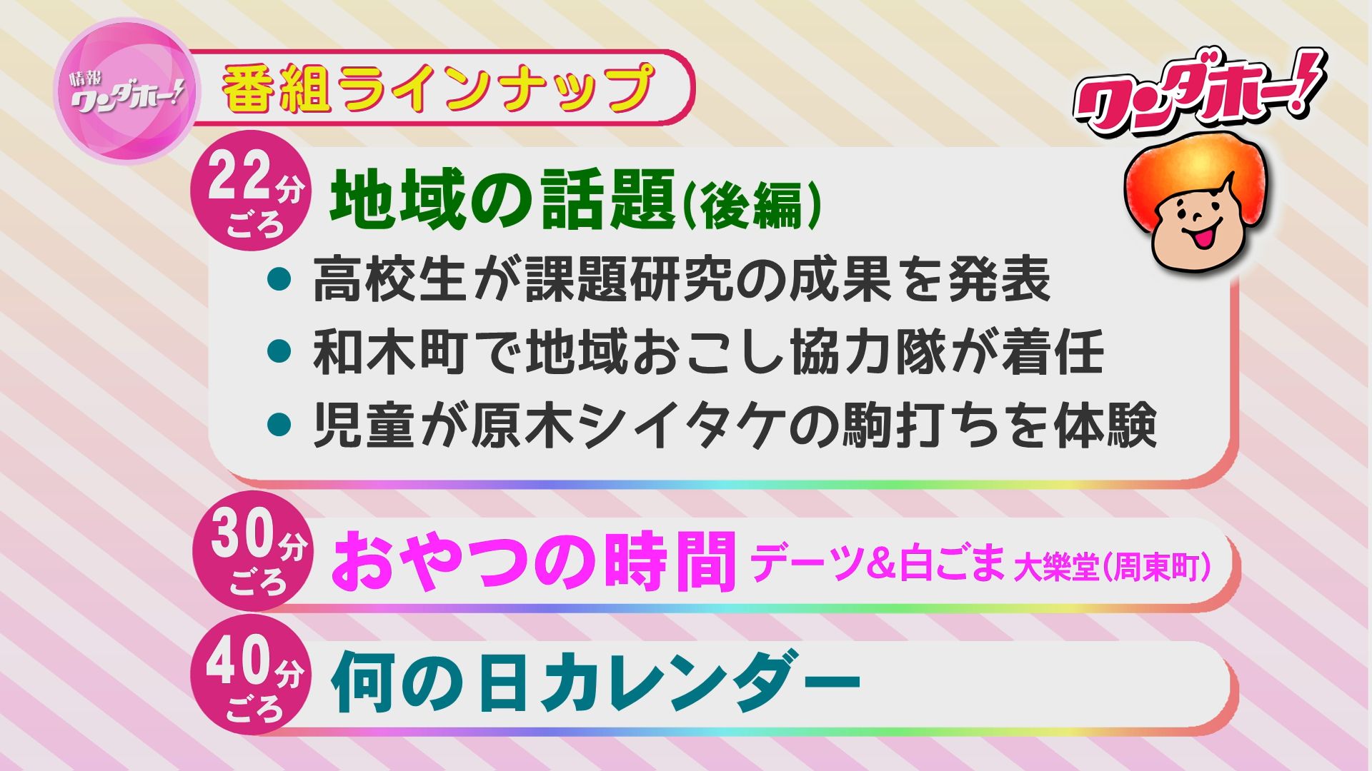 地域の話題、特集、おやつの時間など、盛りだくさんの内容でお届けします!