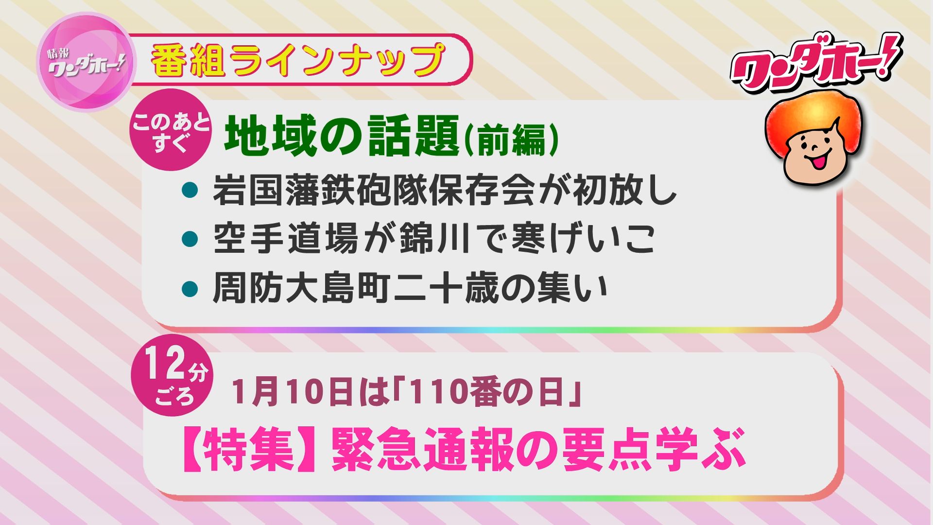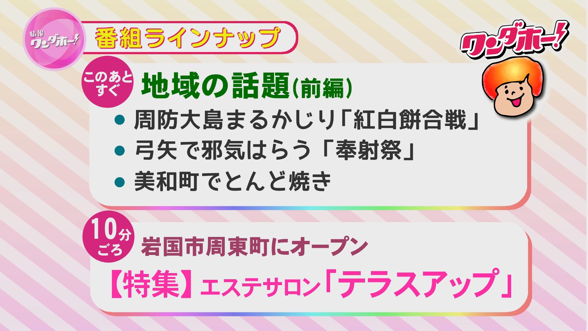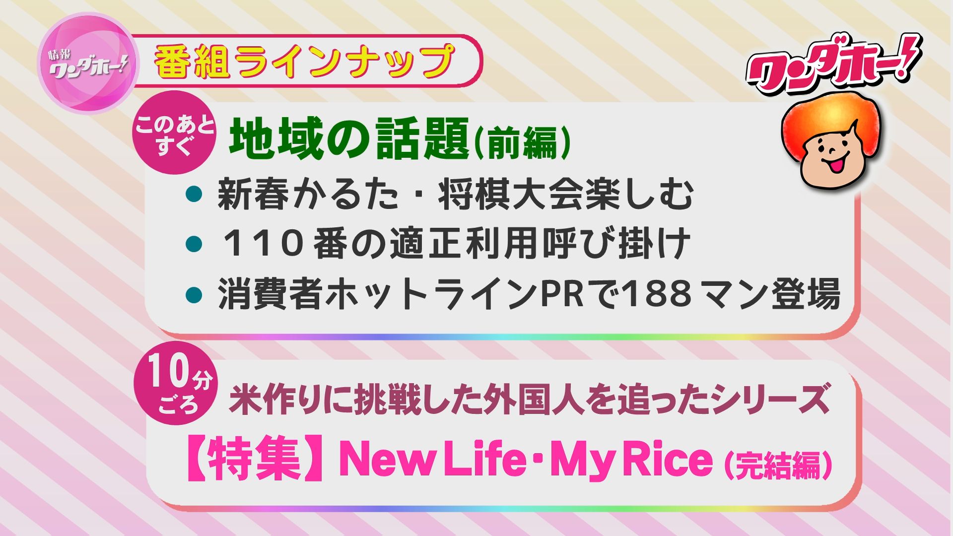 地域の話題、特集、おやつの時間など、盛りだくさんの内容でお届けします!