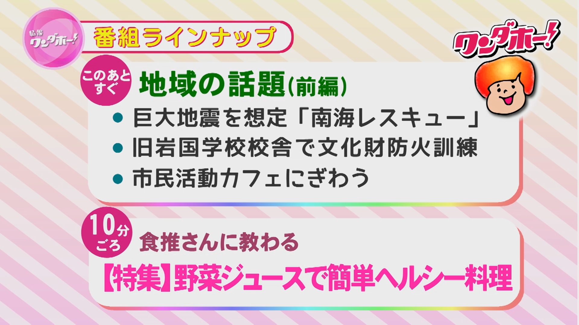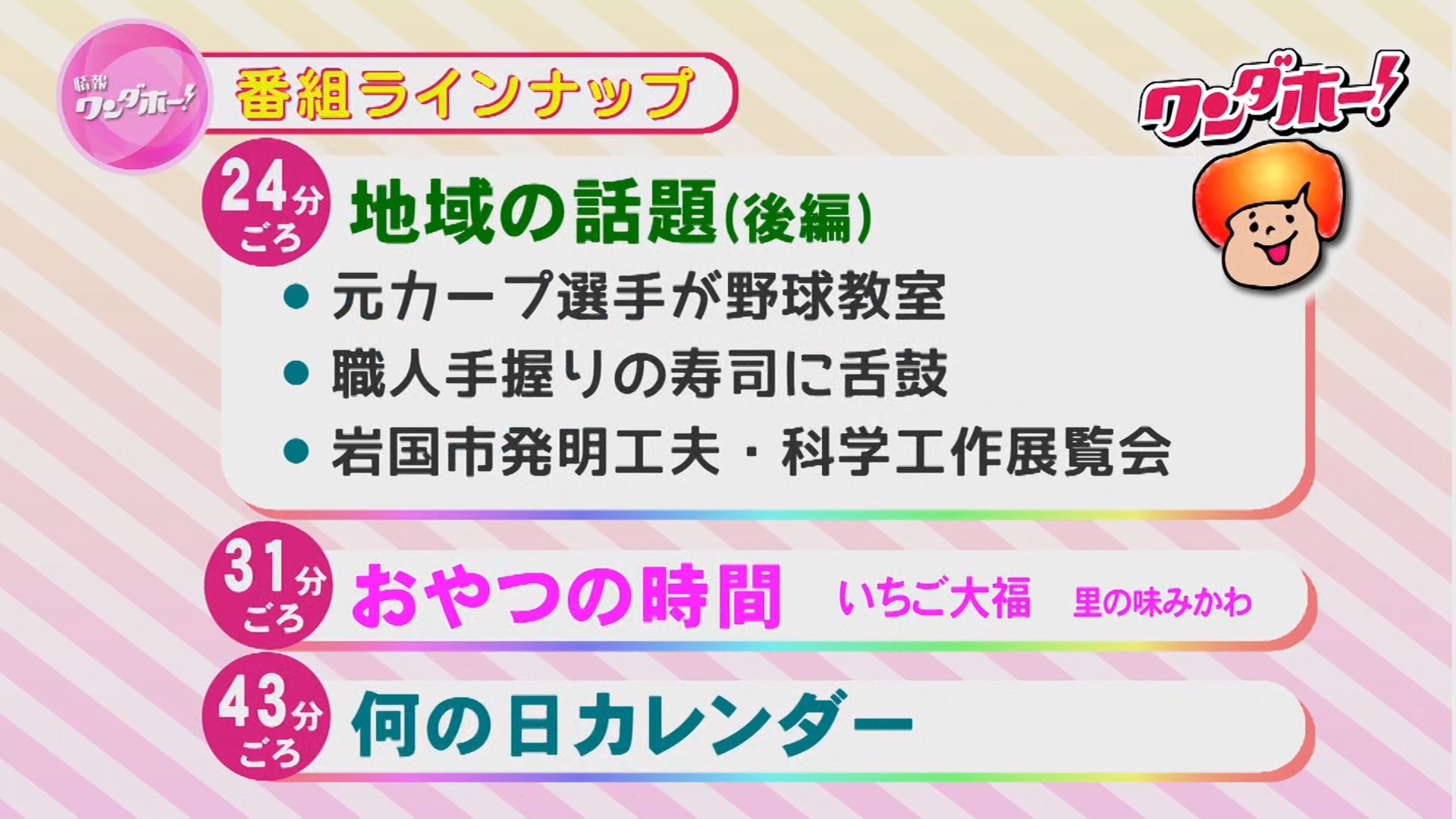 地域の話題、特集、おやつの時間など、盛りだくさんの内容でお届けします!